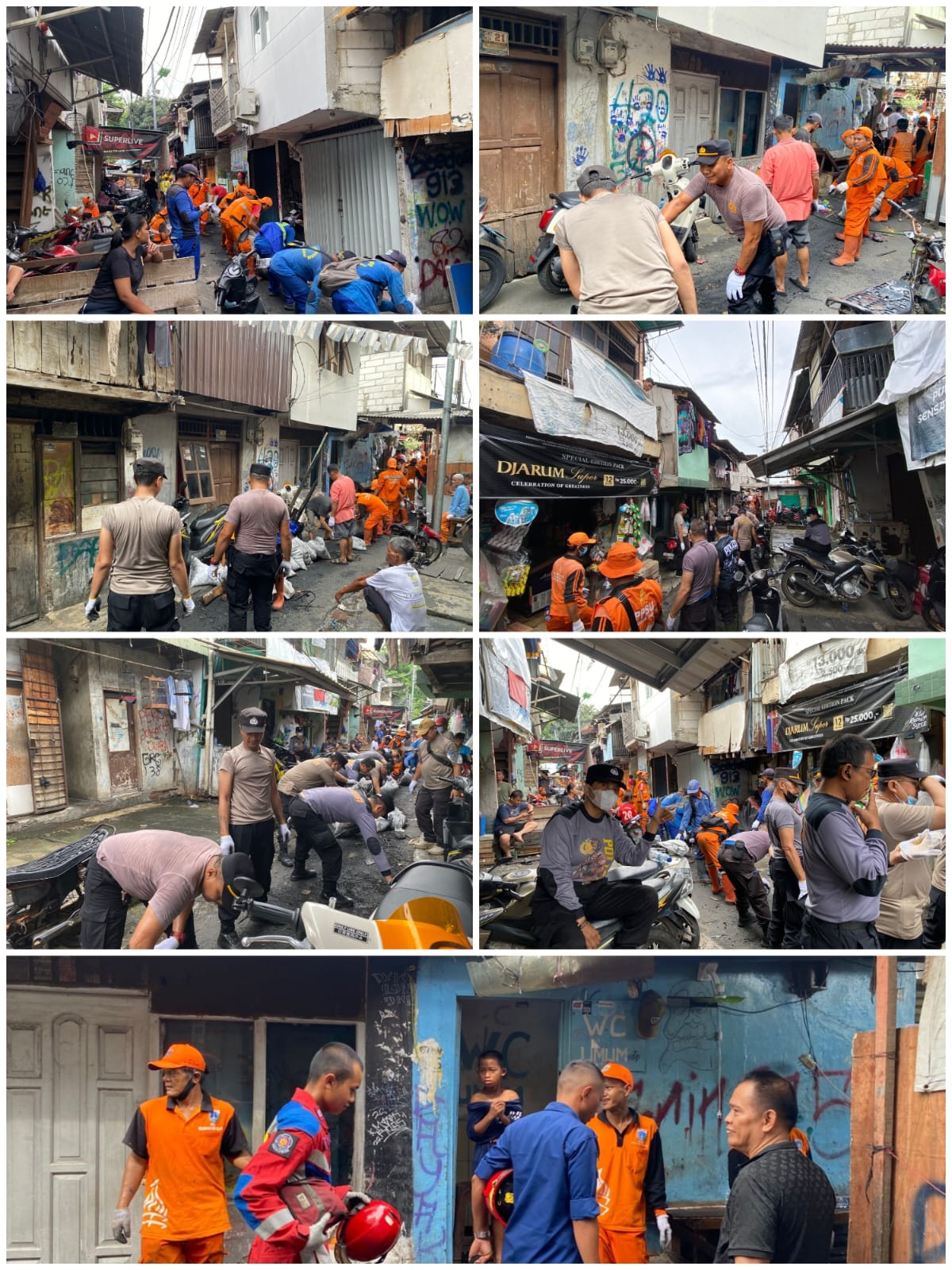 Kerja bakti ini melibatkan 270 personel gabungan, terdiri dari Polsek Tambora, Koramil 02/Tambora, Satpol PP, Damkar, BPBD, pasukan kebersihan (Oren, Biru, Kuning, Hijau), serta aparat kecamatan.