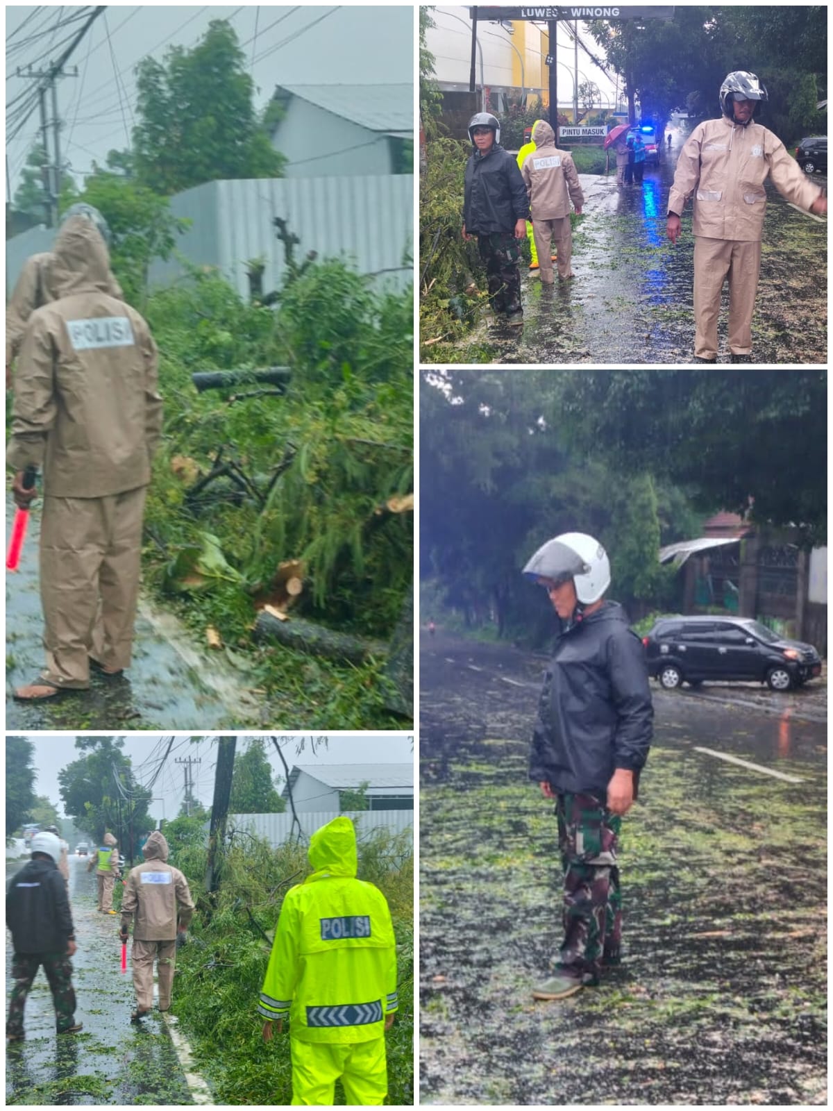 Boyolali. Aksi cepat dilakukan Babinsa Koramil 01/Kota Boyolali Kodim 0724/Boyolali Serma Oko Sutejo bersama Bhabinkamtibmas, personel BPBD, dan warga masyarakat saat sebuah pohon sengon berdiameter sekitar 80 cm tumbang dan menutup akses jalan Boyolali–Jatinom, tepatnya di Dukuh Tegalrejo, Desa Winong, Kecamatan Kota Boyolali, Jumat (5/12/25).