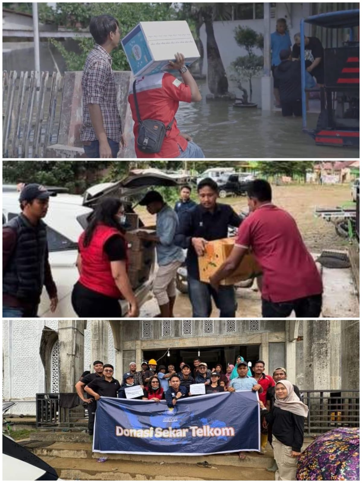 Foto 1, 2, dan 3 : Penyaluran dukungan kemanusiaan dan bantuan logistik untuk para pengungsi dari TelkomGroup.