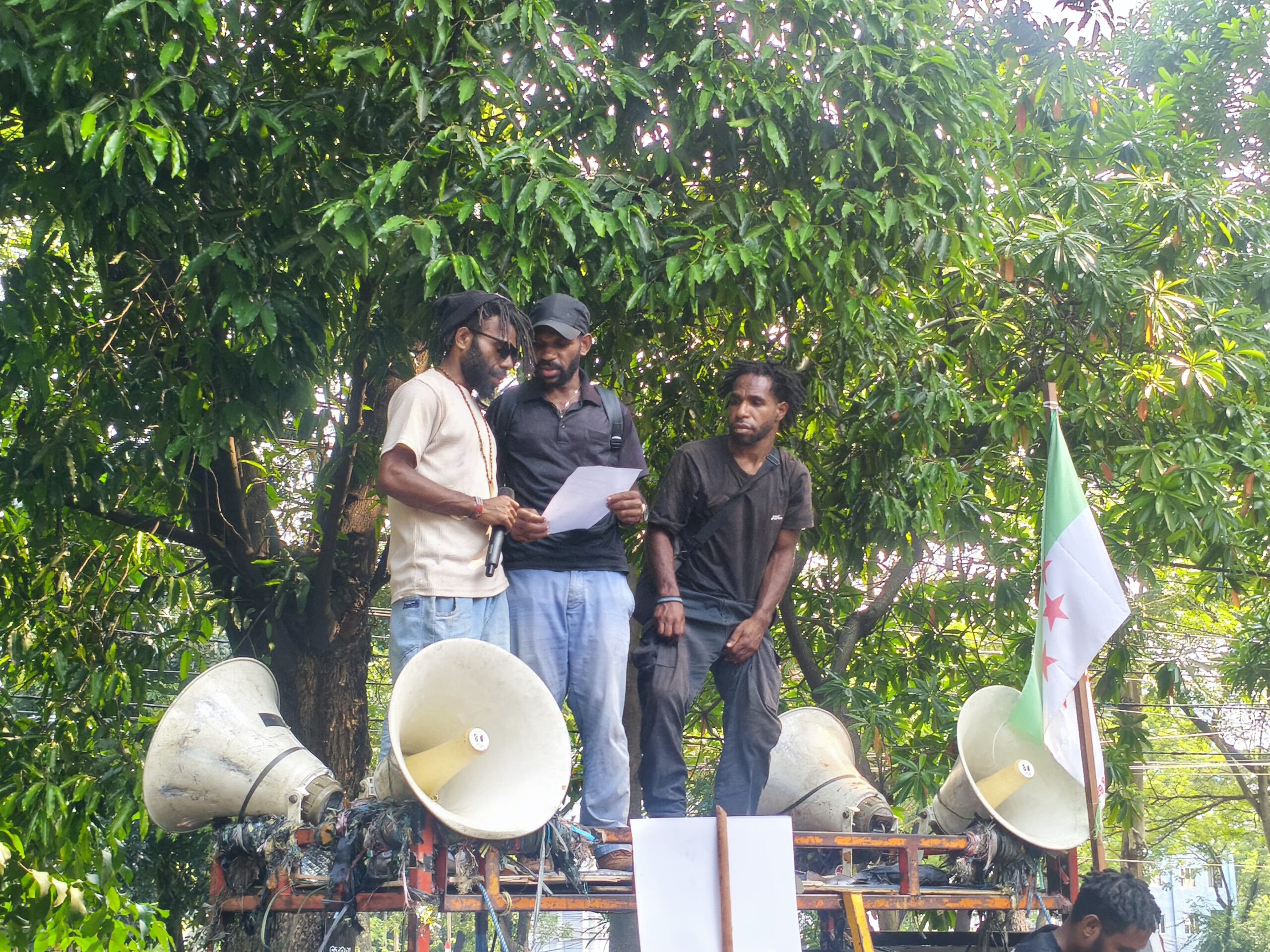 Korlap aksi Emison Wonda dan Tekinus Numang, menegaskan bahwa aksinya kali ini terkait kekerasan oleh militer yang terus terjadi di tanah Papua.