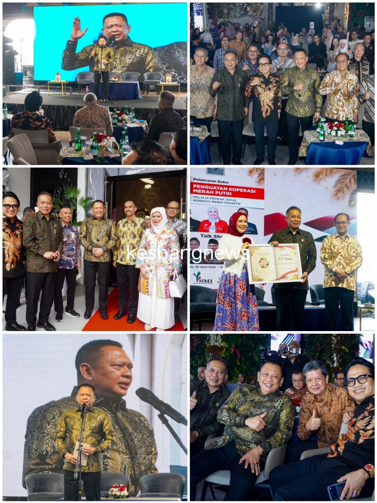 Pernyataan tersebut disampaikan Bamsoet saat peluncuran buku “Penguatan Koperasi Merah Putih Melalui Produk Lokal Berbasis Merek Kolektif”, karya Dr. Dewi Tenty Septi Artiany di Parle Senayan, Kamis (30/4/26). Hadir antara lain Menteri Koperasi Ferry Juliantono, Wakil Menteri Atip Latipulhayat, Ketua Dewan Komisioner Lembaga Penjamin Simpanan (LPS) Anggito Abimanyu, Direktur Eksekutif Hukum LPS Ary Zulfikar, Dirjen Administrasi Hukum Umum Kementerian Hukum Widodo, serta musikus Candra Darusman.