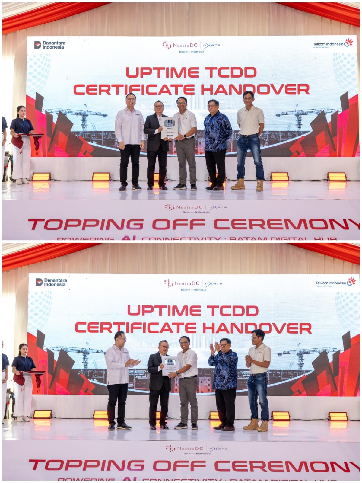 *Batam, 2 November 2025 –* TelkomGroup melalui PT Teknologi Data Infrastruktur (NeutraDC Nxera Batam), yang dimiliki oleh PT Telkom Data Ekosistem (NeutraDC), anak usaha PT Telkom Indonesia (Persero) Tbk (Telkom) berhasil memperoleh Uptime Institute Tier-3 Certification of Design Documents (TCDD) untuk fasilitas Hyperscale Data Center (HDC) NeutraDC-Nxera Batam. Pembangunan fasilitas HDC NeutraDC-Nxera Batam telah memasuki fase akhir yang ditandai dengan penyelenggaraan topping off ceremony pada Kamis, (30/10) lalu dan siap beroperasi pada tahun 2026. Sertifikasi ini menandai pencapaian penting dalam memastikan keandalan, keamanan, dan kesiapan operasional pusat data berstandar internasional yang menjadi fondasi ekosistem digital Indonesia.