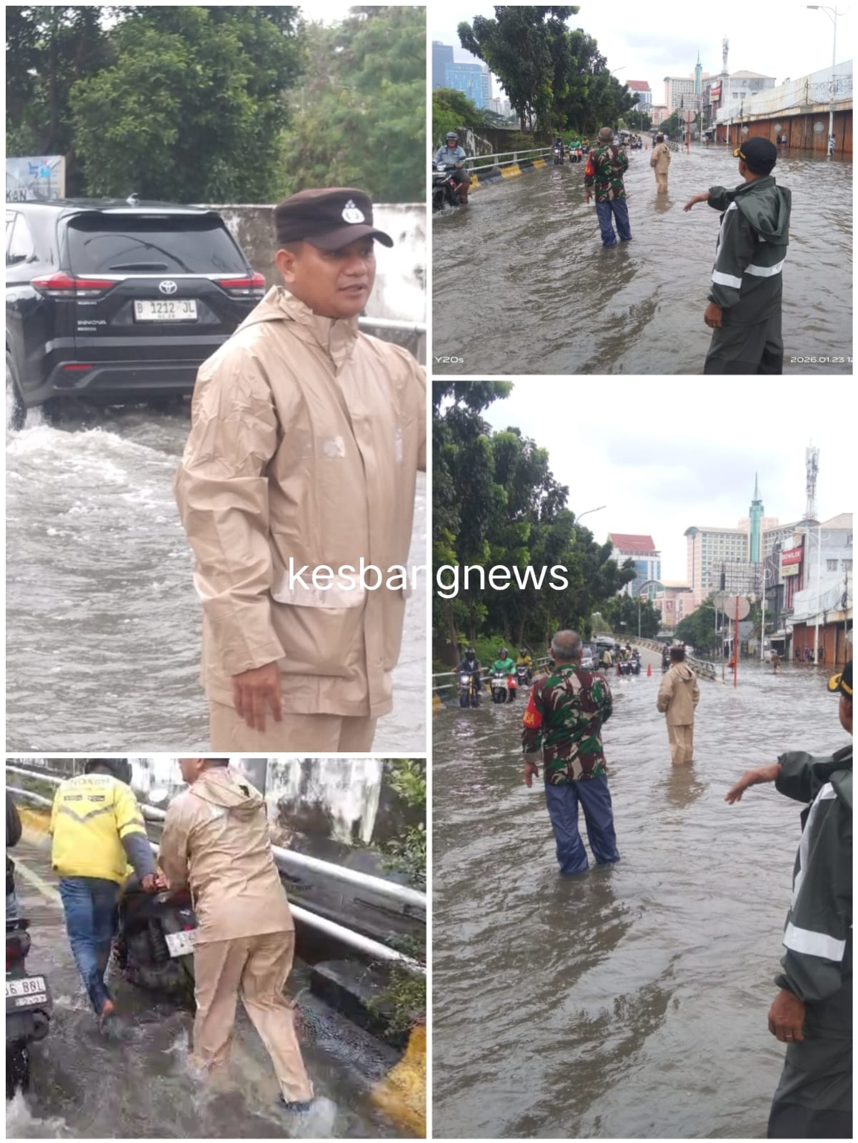 Bhabinkamtibmas Kelurahan Jelambar AIPDA Fitrah Amirullah bersama 3 Pilar tidak hanya melakukan pemantauan, namun juga aktif membantu pengaturan arus lalu lintas serta menolong pengendara sepeda motor yang mengalami mogok saat melintasi genangan air.