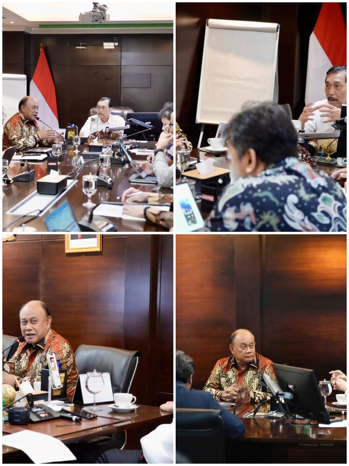 Kepala Badan Gizi Nasional (BGN), Dadan Hindayana didampingi Kepala Biro Hukum dan Humas BGN, Khairul Hidayati saat berkunjung kepada Ketua Dewan Ekonomi Nasional (DEN), Luhut Binsar Pandjaitan, dalam rangka koordinasi data, sebagai bagian dari upaya memperkuat sinergi antar-lembaga dalam mendukung Program Makan Bergizi Gratis (MBG) di kantor DEN di Jakarta, Jumat, 3 Oktober 2025.