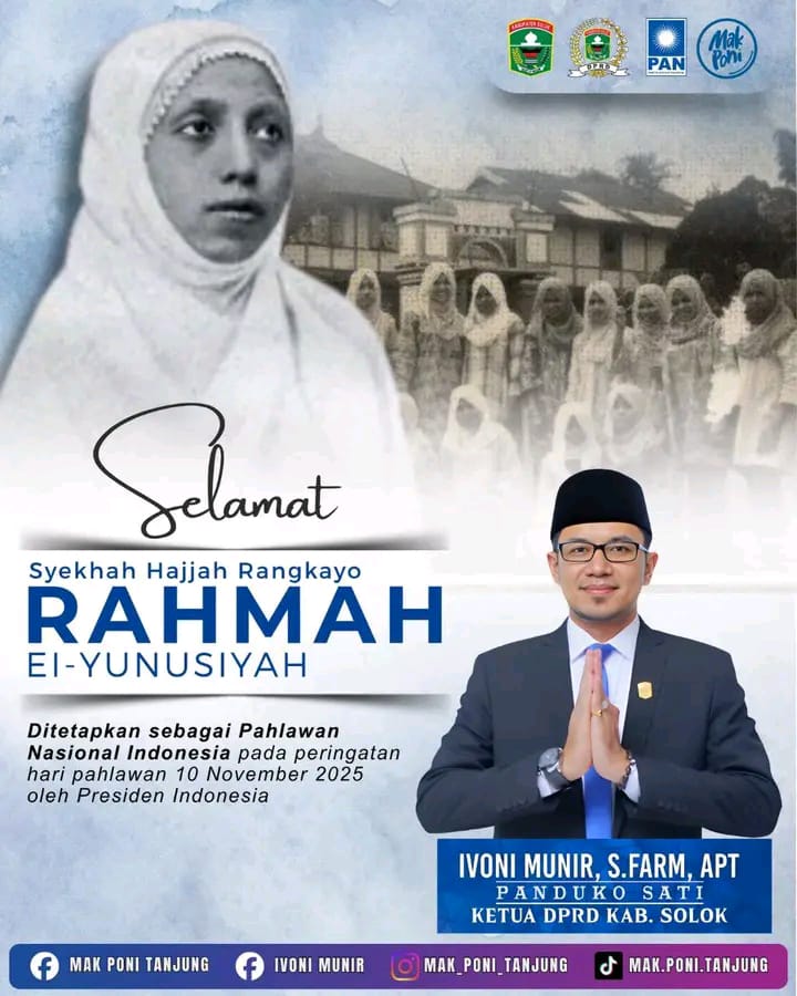 “Selamat untuk masyarakat Sumatra Barat, terutama warga Padang Panjang. Semoga semangat perjuangan dan dedikasi Syekhah Hajjah Rang Kayo Rahmah El Yunusiyah terus hidup dalam jiwa kita semua,” tutup Ivoni Munir, S. Farm., Apt dengan penuh rasa hormat.