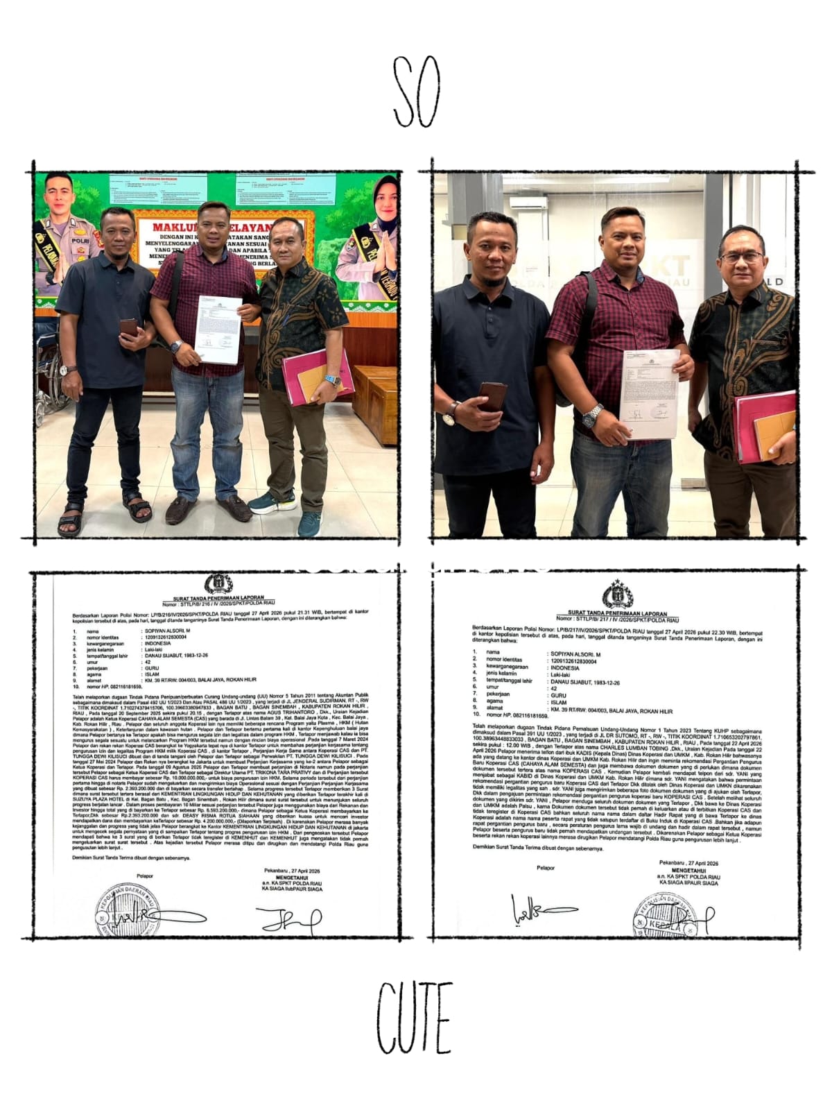 “Kronologi bermula pada 22 April 2026, saat pelapor menerima informasi dari Kepala Dinas Koperasi dan UMKM Kabupaten Rokan Hilir, terkait adanya pihak yang mengajukan permohonan rekomendasi pergantian pengurus Koperasi CAS. Pengajuan tersebut disertai sejumlah dokumen yang mengatasnamakan Koperasi CAS,” ucapnya.