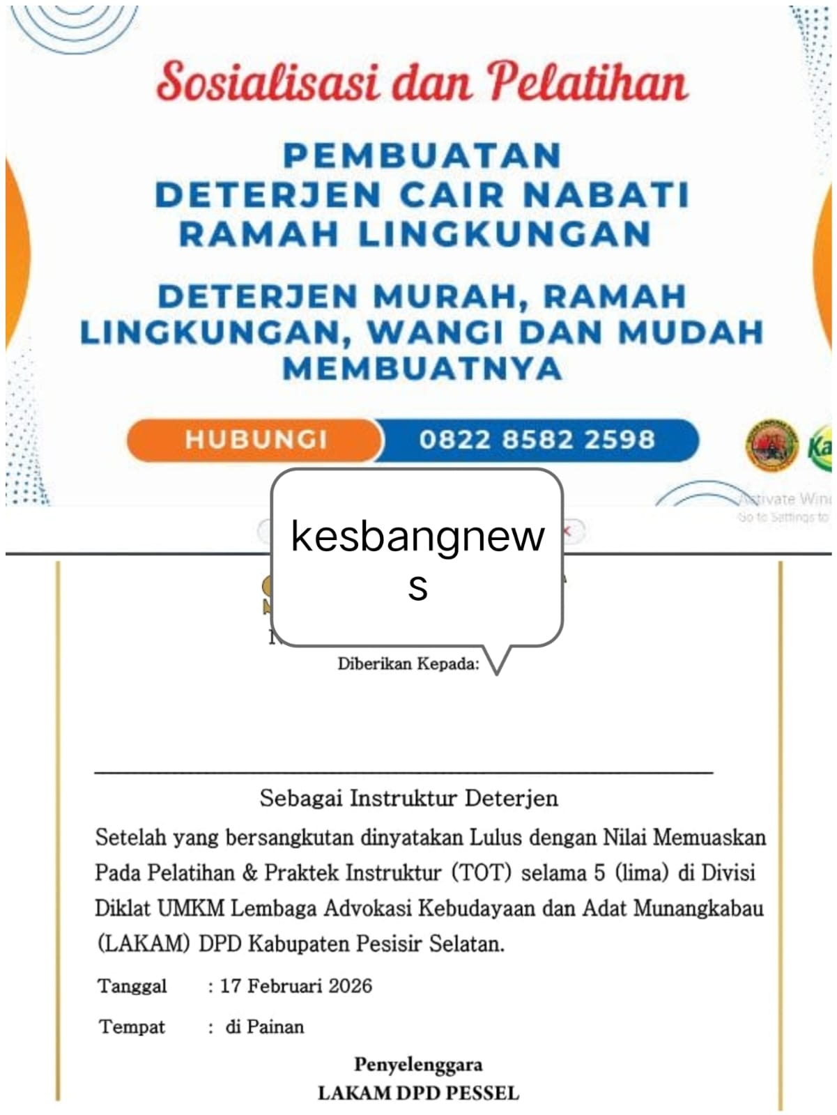 Pelatihan Instruktur Deterjen telah dimulai sebelum bulan Ramadhan dan masih berlanjut sampai hari ini. Metode Pelatihan yang digunakan campuran Luring dan Daring, ujar ketua LAKAM DPD Pessel dr H Misri Hasanto,SH.,M.Kes, Jumat (20/02/2026).