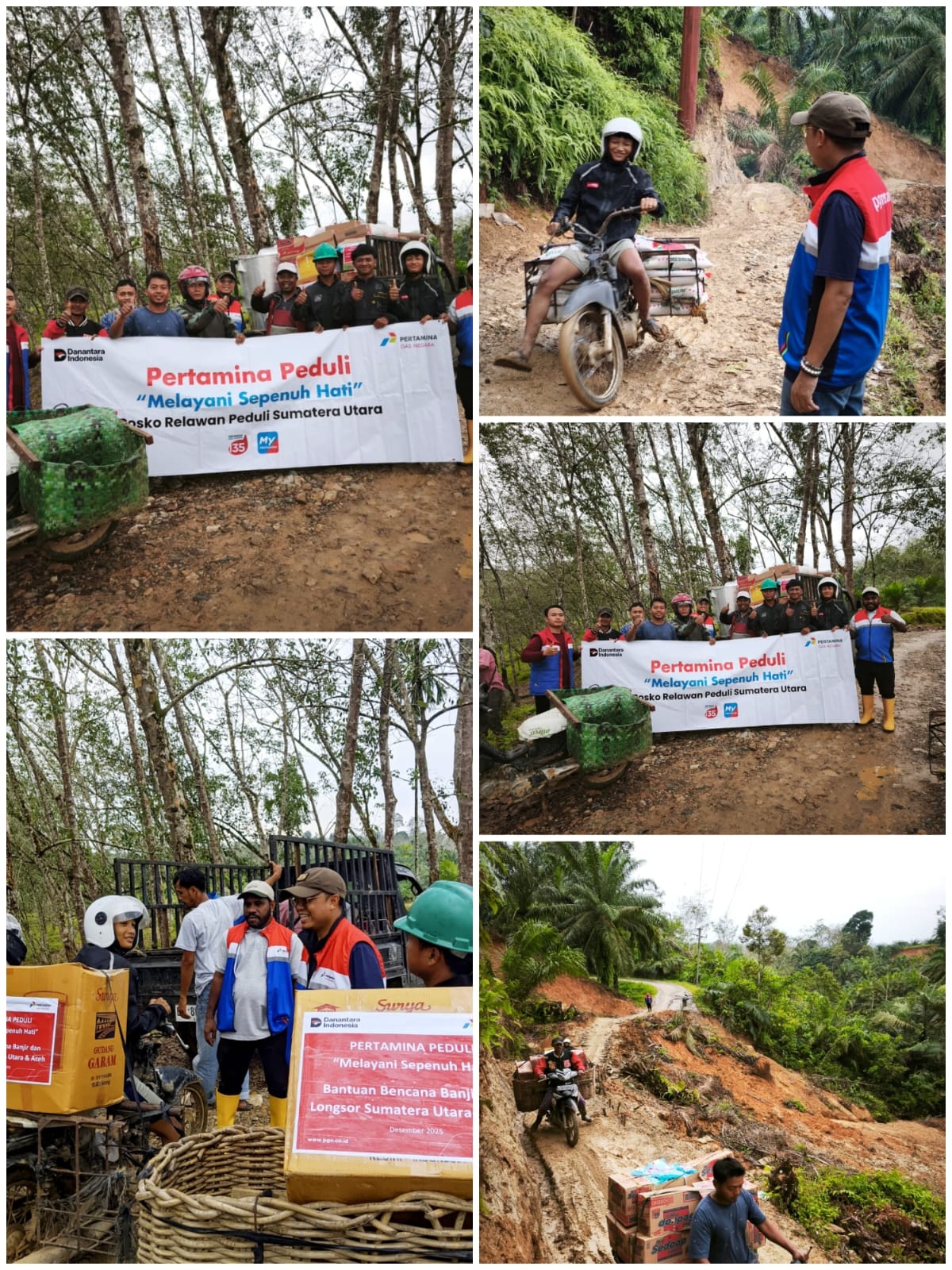 Akibat akses yang masih terputus akibat longsor, tim PGN harus terlebih dahulu melangsir bantuan hingga titik terdekat yang masih dapat dilalui kendaraan roda empat. Dari lokasi tersebut, dengan dukungan warga, tim PGN melanjutkan perjalanan menggunakan motor trail angkut sawit untuk menembus jalur licin dan terjal hingga mencapai permukiman warga yang membutuhkan bantuan.