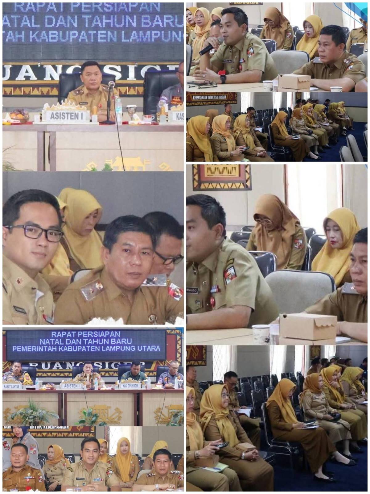 Lampung Utara — Pemerintah Kabupaten Lampung Utara menggelar rapat koordinasi persiapan pengamanan Natal dan Tahun Baru (Nataru) di Ruang Siger Setdakab, Senin. Rapat dipimpin oleh Asisten I, Drs. Mat Soleh, M.Pd, mewakili Bupati Lampung Utara, dan dihadiri Kasat Lantas Polres Lampung Utara, Kepala Dinas Perhubungan Anom Sauni, S.H., M.M., beserta jajaran kepala dinas terkait.