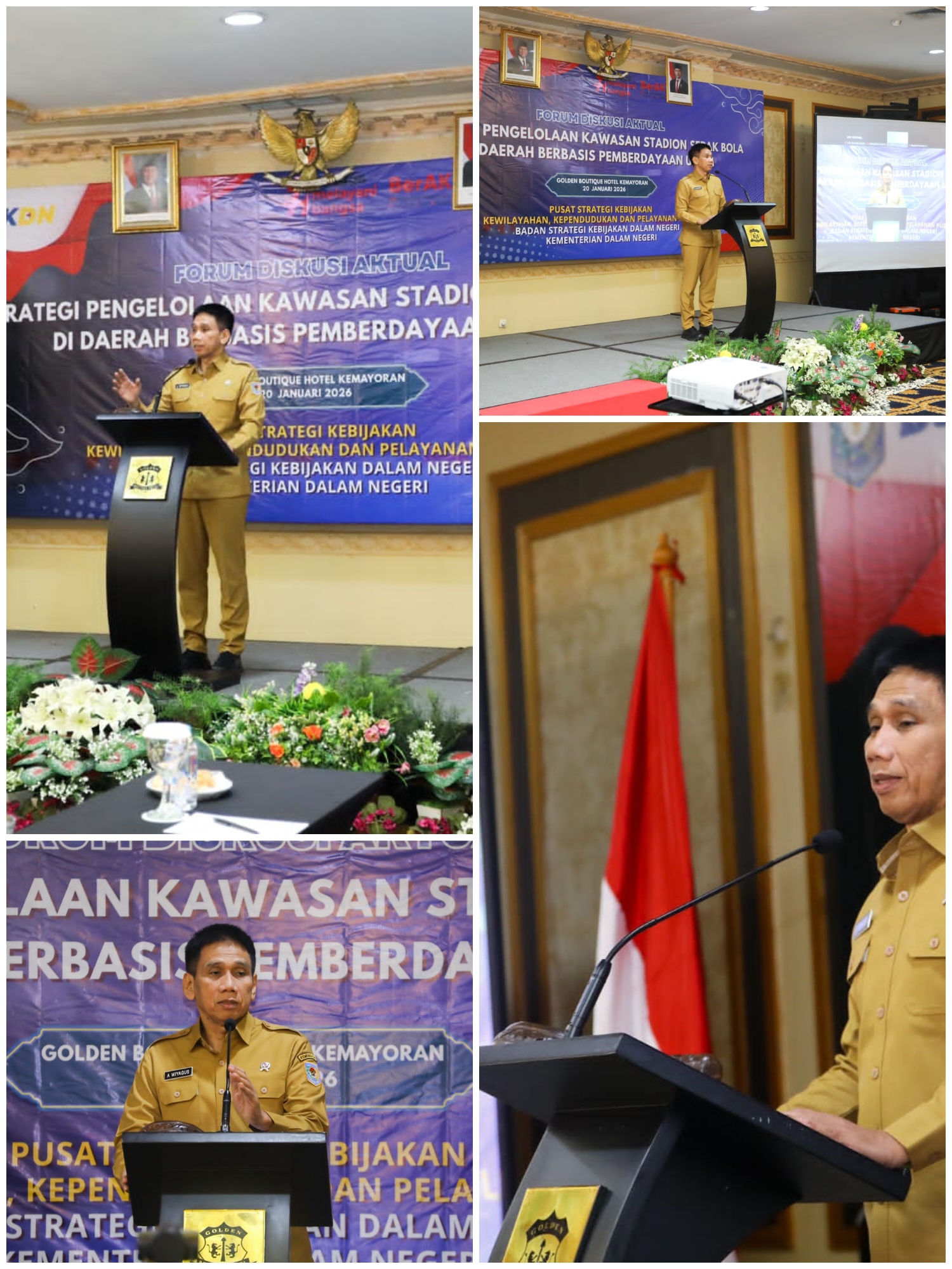 *Jakarta*- Kementerian Dalam Negeri (Kemendagri) mendorong pemerintah daerah untuk mengoptimalkan pemanfaatan stadion sebagai upaya memperkuat ekosistem sepak bola sekaligus pemberdayaan usaha mikro, kecil, dan menengah (UMKM). Hal itu diungkapkan Wakil Menteri Dalam Negeri (Wamendagri) Akhmad Wiyagus saat membuka Forum Diskusi Aktual (FDA) bertema “Strategi Pengelolaan Kawasan Stadion Sepak Bola Berbasis Pemberdayaan UMKM” di Hotel Golden Boutique pada Selasa, 20 Januari 2026.