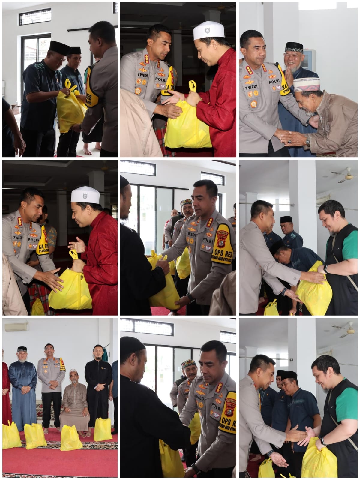 Usai Salat Jumat, Kapolres secara simbolis menyerahkan paket bantuan berupa beras, mie instan, minyak goreng, gula, serta teh dan kopi yang diberikan kepada imam dan marbot Masjid Al Kautsar.