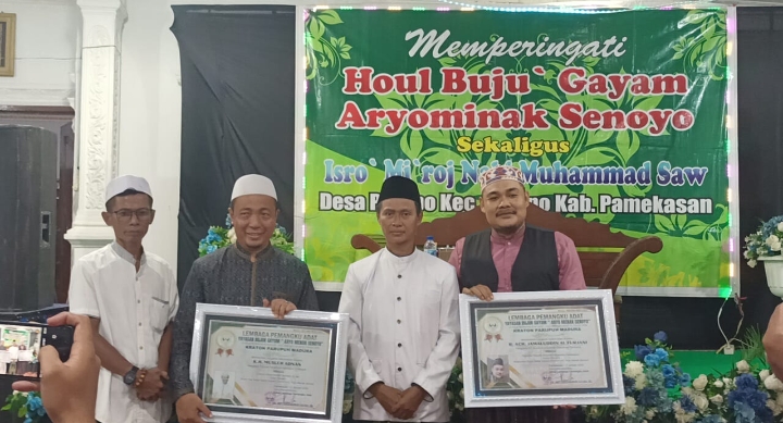 [ Teks Gambar: Keraton Parupuh Aryo Menak Senoyo Madura memberikan anugerah kehormatan kepada para tokoh agama sebagai bentuk apresiasi atas dedikasi dalam dakwah dan pelestarian nilai-nilai keislaman pada rangkaian Haul Agung Aryo Menak Senoyo dan Isra Mi’raj Nabi Muhammad SAW di Desa Proppo, Pamekasan.Ist ]