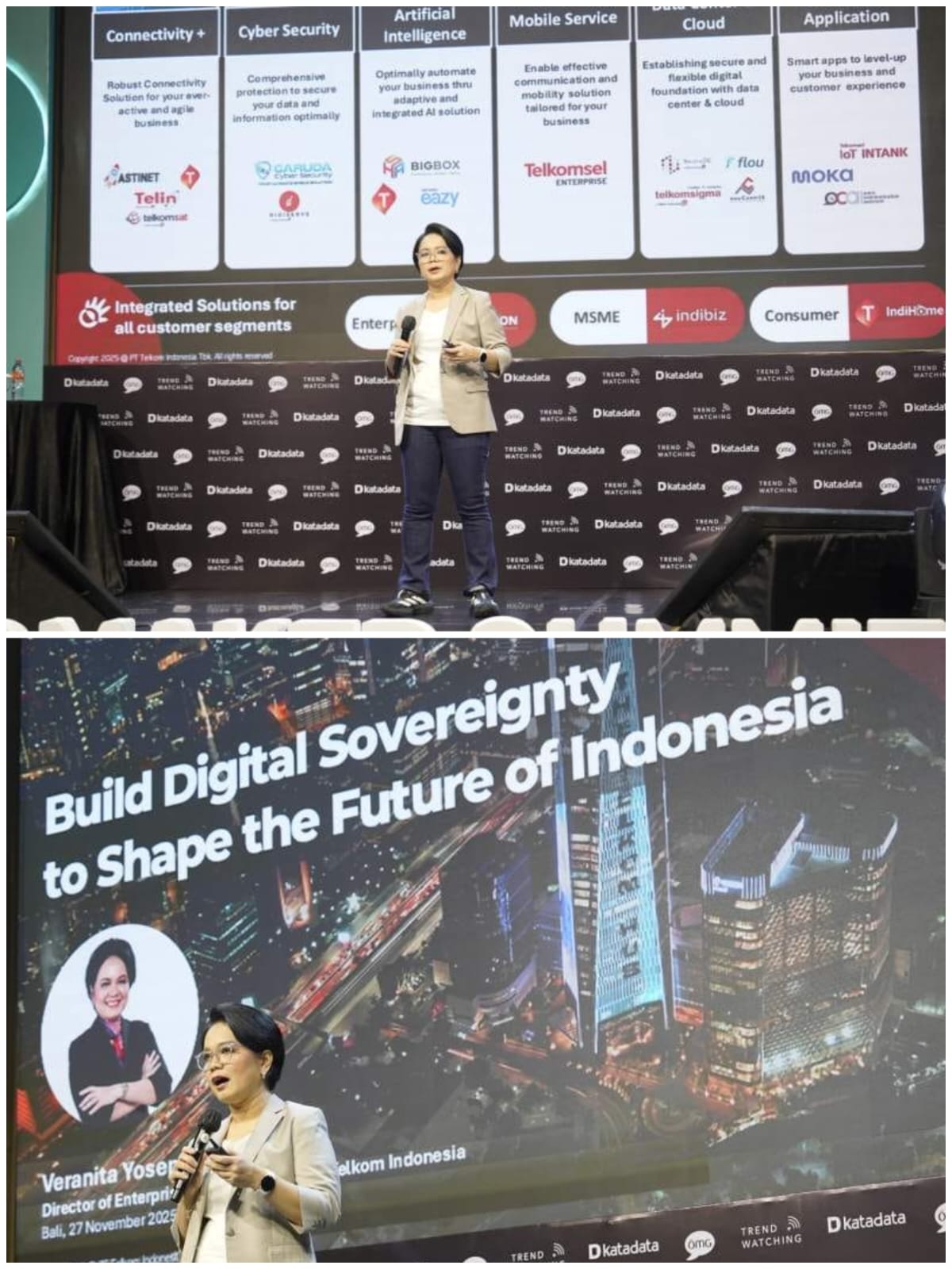 Komitmen tersebut disampaikan oleh Direktur Enterprise & Business Service Telkom, Veranita Yosephine, dalam Trend Maker Summit 2025 yang diselenggarakan oleh Katadata Indonesia, OMG Consulting, dan Trend Watching di Jimbaran, Bali (27/11).